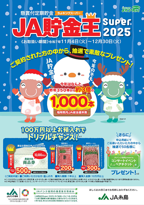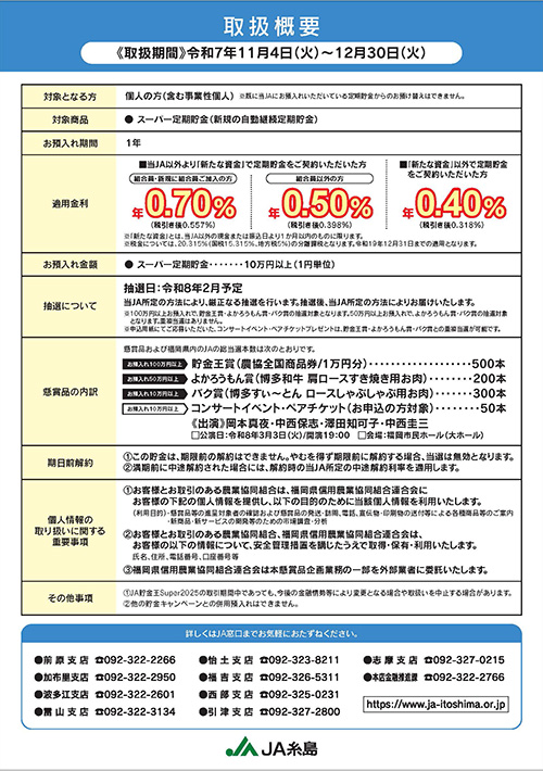 ・この貯金は、期限前の解約はできません。やむを得ず期限前に解約する場合、当選は無効となります。 ・満期前に中途解約された場合には、解約時の当JA所定の中途解約利率を適用します。 ・JA貯金王Super2025の取引期間中であっても、今後の金融情勢等により変更となる場合や取扱いを中止する場合があります。 ・他の貯金キャンペーンとの併用預入れはできません。 |