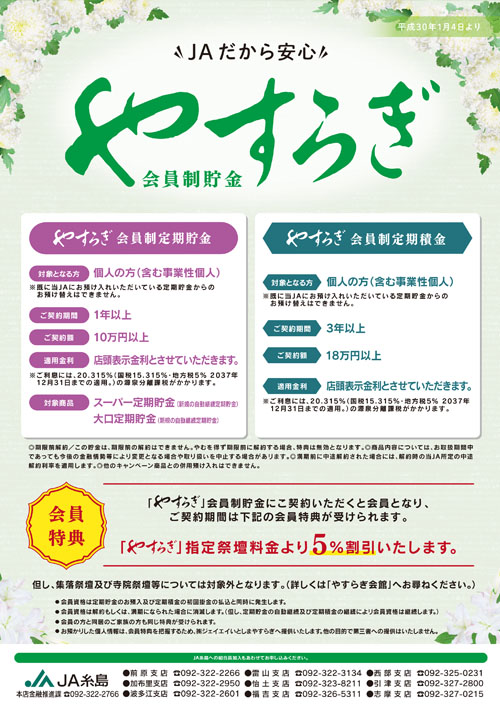 ・会員資格は定期貯金のお預け入れ及び定期積金の初回掛金の払込と同時に発生します。 ・会員資格は解約もしくは、満期になられた場合に消滅します。 (但し、定期貯金の自動継続および定期積金の継続により会員資格は継続します。) ・会員の方と同居のご家族の方も同じ特典が受けられます。 ・お預かりした個人情報は、会員特典を把握するため、㈱ジェイエイいとしまやすらぎへ提供いたします。他の目的で第三者への提供はいたしません。 |